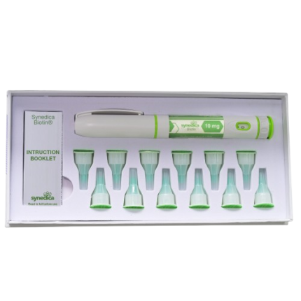 The Synedica Biotin® 40mg Injection Pen Kit contains 1 pen, 12 disposable needles and an instruction booklet.